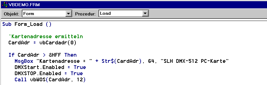 Dazu dient die Funktion vbCardAdr. Sie fragt Ihren PC ab und gibt die aktuelle Kartenadresse, mit der Sie dann fortan arbeiten können, zurück. Um die DIP-Schalter Einstellung der Karte müssen Sie sich also nicht kümmern.