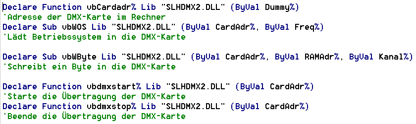 Wenn Sie unsere Karte aus dem Karton nehmen, ist sie "dumm". Das bedeutet: wir müssen ihr erst einmal ein Betriebssystem laden, damit sie DMX ausgeben kann, und dann müssen wir die Funktionen deklarieren, mit denen wir dies Betriebssystem ansprechen. Auch das Laden des Betriebsprogramms kann durch eine dieser Funktionen erfolgen. Sie sind in einer datei namens SLHDMX2.DLL gespeichert, die als Windows Laufzeitbibliothek geladen wird. Bevor die Funktionen einer DLL genutzt werden können, müssen sie der Programmierumgebung bekanntgemacht werden, sie müssen deklariert werden.