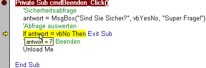 VB bleibt wieder an gleicher Stelle stehen. Lassen Sie uns nun genau analysieren, was bei den einzelnen Befehlen passiert. Halten Sie dazu Ihren Mauszeiger über die Variable "Antwort".