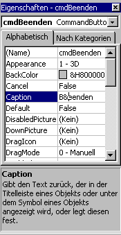 Wenn Sie ein Feld in der Eigenschaftsseite auswählen, erscheint im unteren Teil des Eigenschaftenfensters eine kurze Beschreibung . In der Abbildung links hat die Eigenschaft "Caption" den Fokus. Die Eigenschaft "Caption" dient nur der Beschriftung (hier: eines Buttons) und ist für VB nicht weiter von Bedeutung. Sie können die Beschriftung nun durch klicken in das Textfeld neben Caption ändern. Bitte tragen Sie "B&eenden" ein. Das &-Zeichen weist VB an, den darauf folgenden Buchstaben als Shortcut zu verwenden. Der Buchstabe wird auf dem Button unterlegt dargestellt und ist im laufendem Programm mit Alt + Zeichen erreichbar. Die Eigenschaft "(Name)" kennzeichnet den Objekt-Namen des Buttons. Unter diesem Namen ist Ihr Button später im Programmcode erreichbar. Dieser Name ist wärend der Programmierung sehr wichtig und sollte nicht von dem (vom Programmierer) vergebenen Namen abweichen, damit die Beispielprogramme auch funktionieren. |