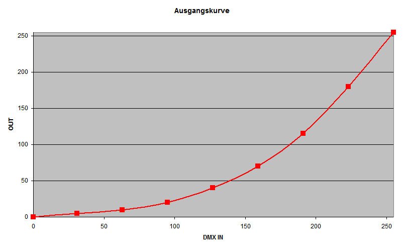 9 Bytes sind Kurvendaten, die im vorliegenden Falle die folgende Regelkurve ergeben. Bitte beachten Sie, daß der e:cue Controller alle Werte