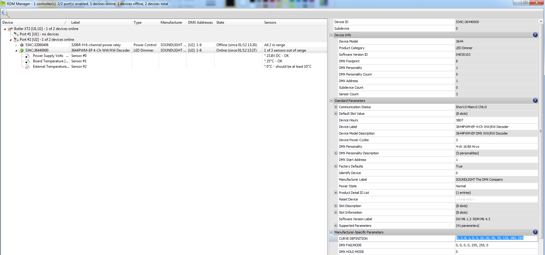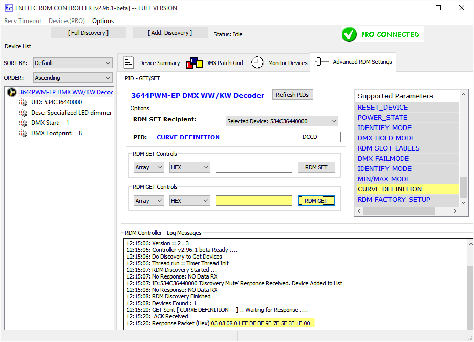 Select tab "Advanced RDM Settings" and choose PID 0343 (CURVE). We will now set the output curve to user curve to be able to check the results of