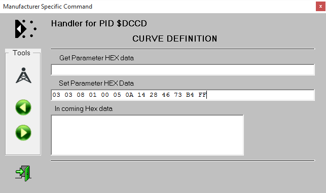To save this curve, enter the four configuration bytes (see above), then enter the 9 curve data, and then issue a SET command.