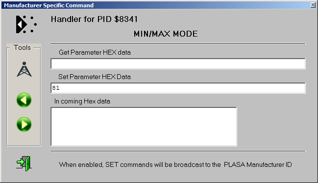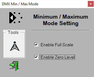 The GET/SET application will open the OUTPUT SETTINGS dialog. In "Output Curve Setting" select the USER CURVE entry. You may want to open the fader panel and check the response; you may find that the control range is wider and intensity starts at a lower level. This is due to the non-linear characteristic of this curve. Use the MINMAXMODE funktion to disable the zero point. Also, the remaining span (from minimum level to maximum level) will be expanded to full input control range - which makes intensity control more sensitive. Open the PID list and click PID 8341 (MIN/MAX MODE)