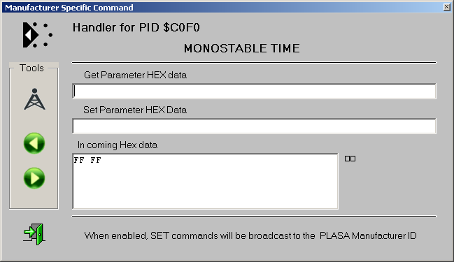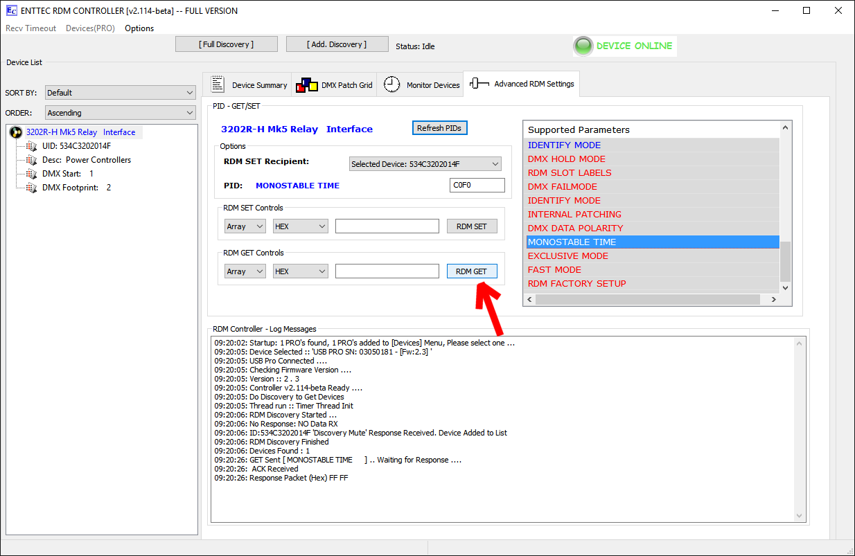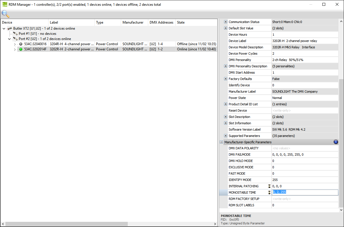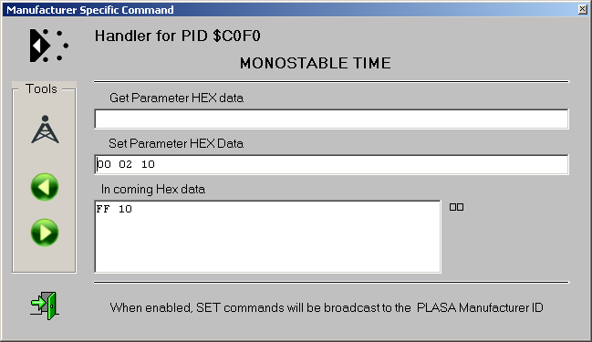- Open the RDM MANAGER and select the device to be configured. That will read the property list. Scroll down the list and click PID C0F0 (MONOSTABLE TIME).