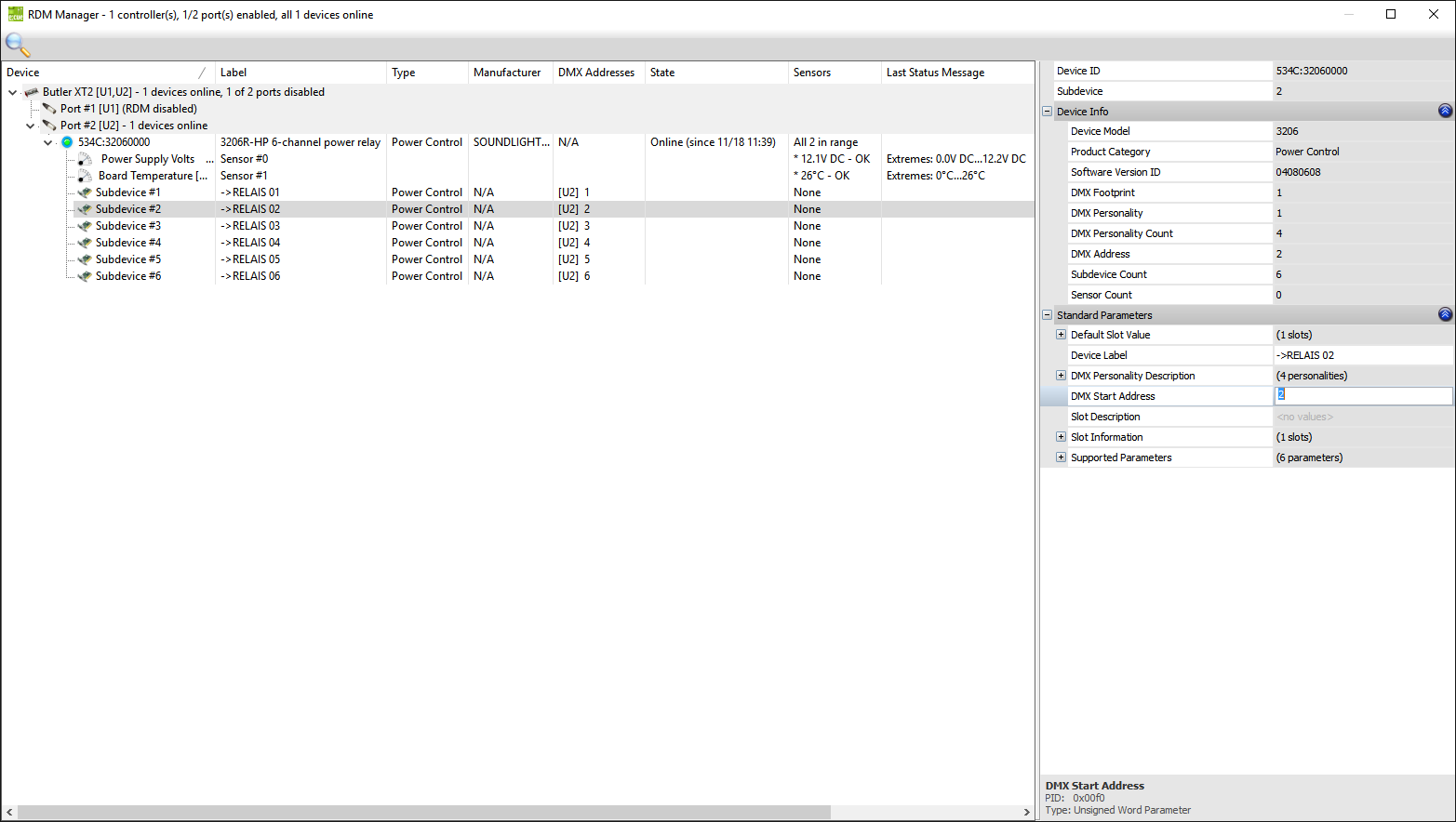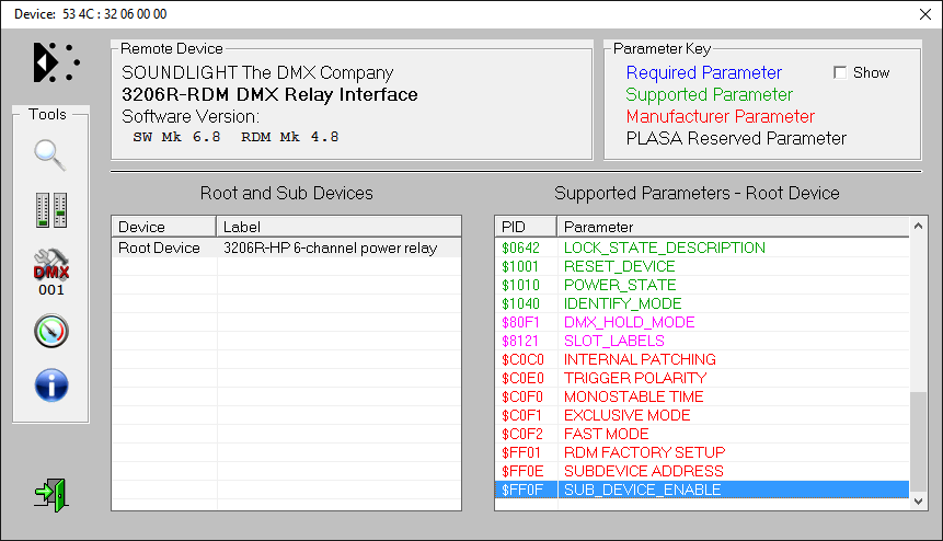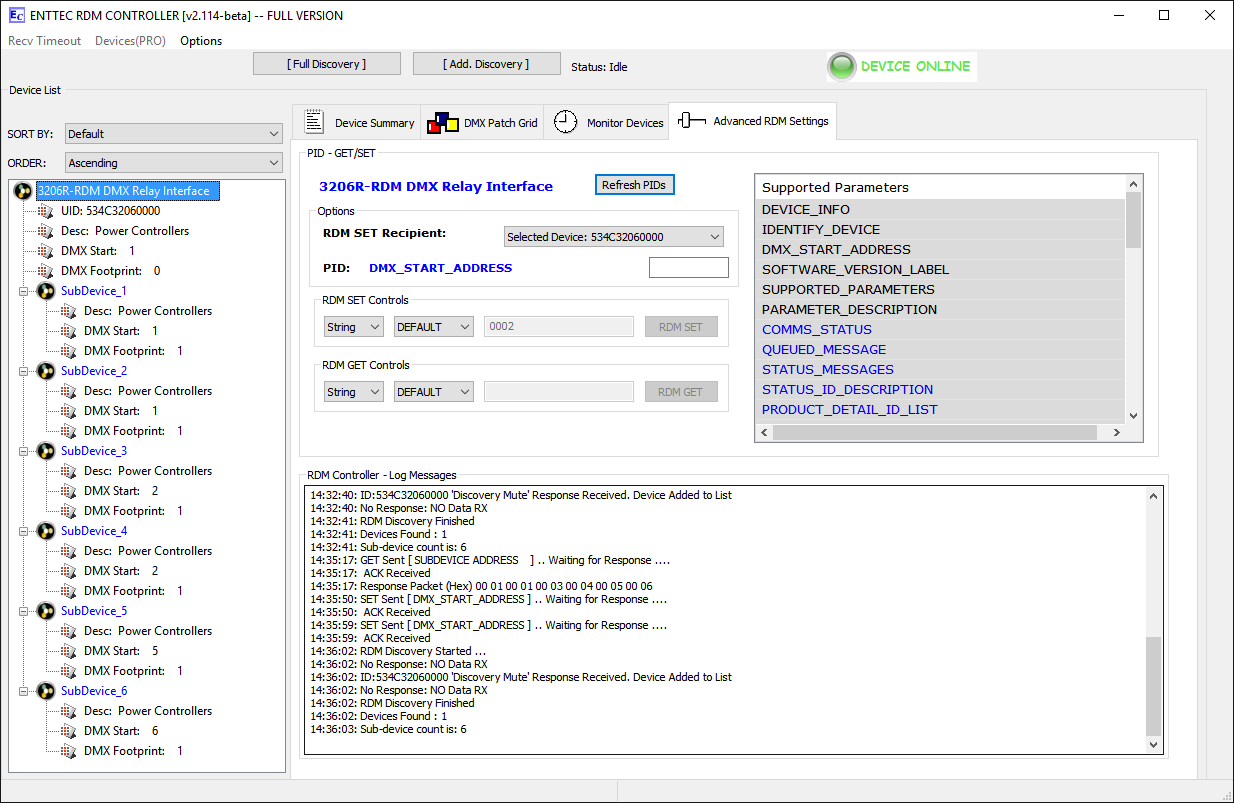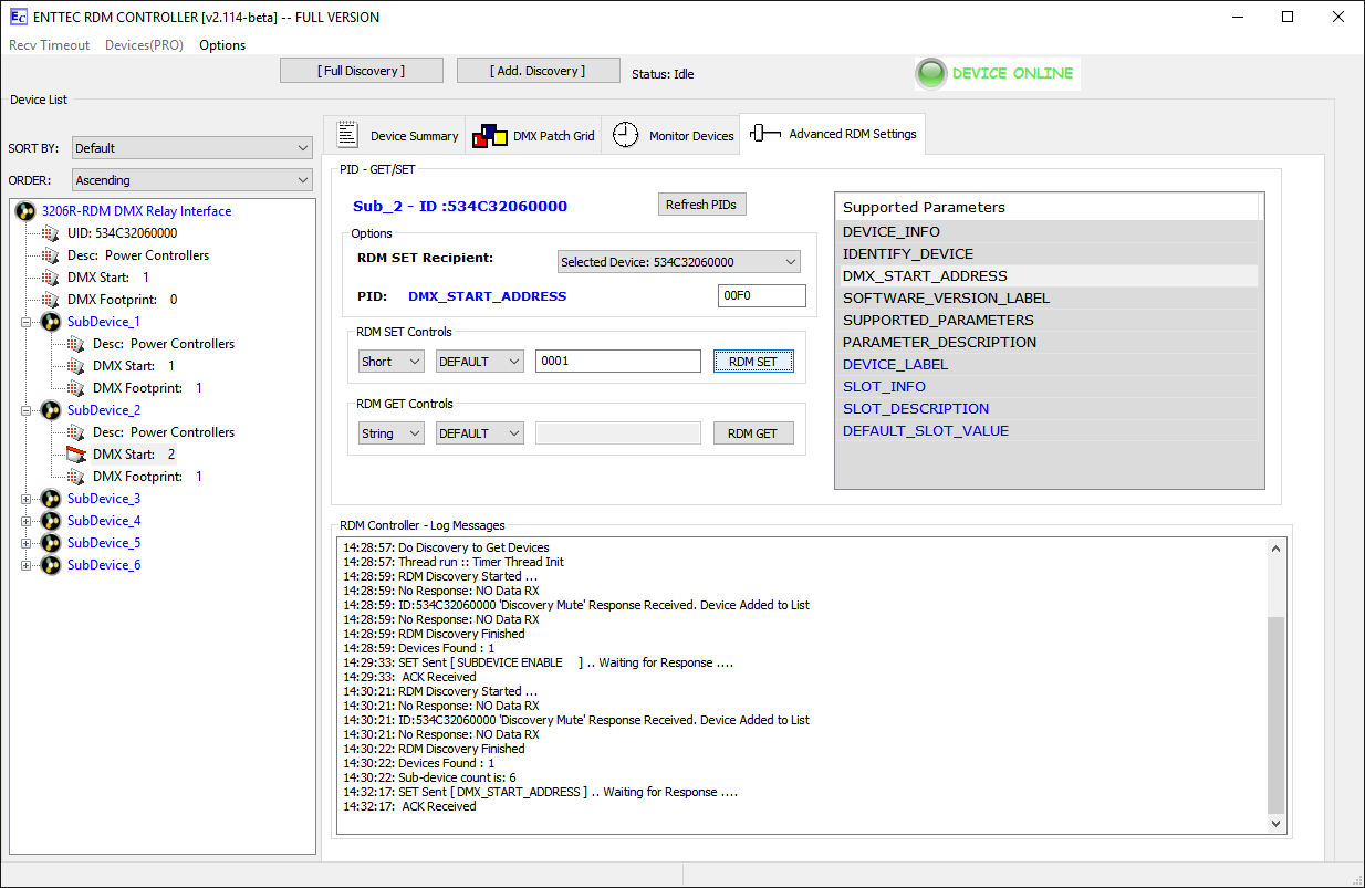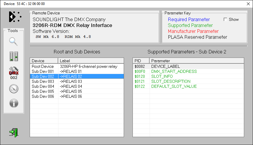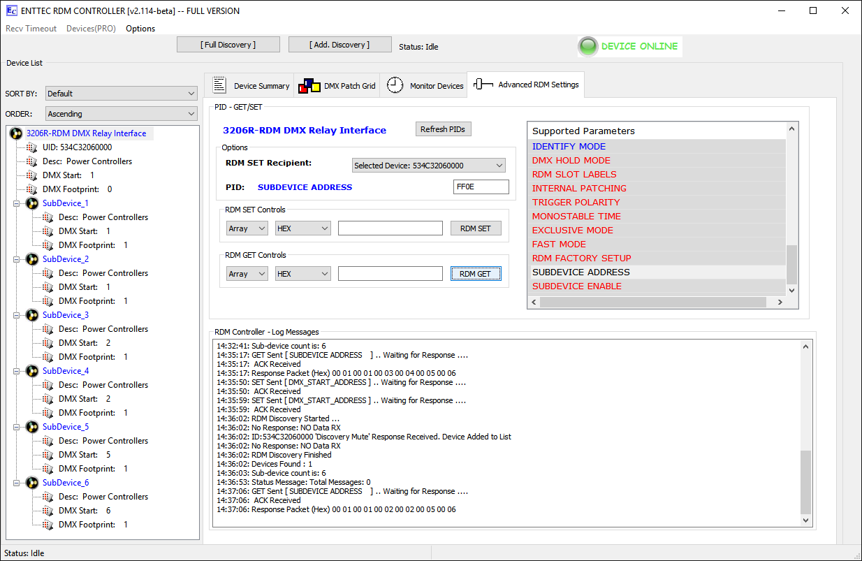 Relaismodule werden im Standardmodus (eine Startdadresse und ein Block von nachfolgenden Adressen für jedes Relais) ausgeliefert. Die Umstellung auf Sub-Device-Modus ist per RDM möglich. Dabei wird das Relaismodul virtuell in mehrere einzelne Einheiten zerlegt (ein 6-Kanal Modul in 6 einzelne Relais), von denen jedes dann eine eigene Startadresse bekommen kann. Bitte beachten Sie, dass die Einstellung über ein Adressboard dann nicht mehr möglich ist. Zudem unterstützen nicht alle RDM-Controller den Subdevice-Modus. |