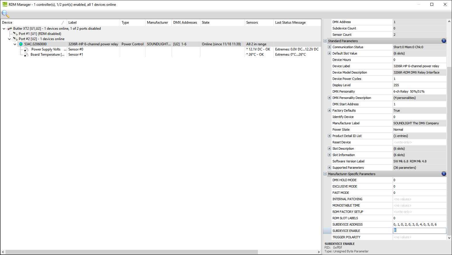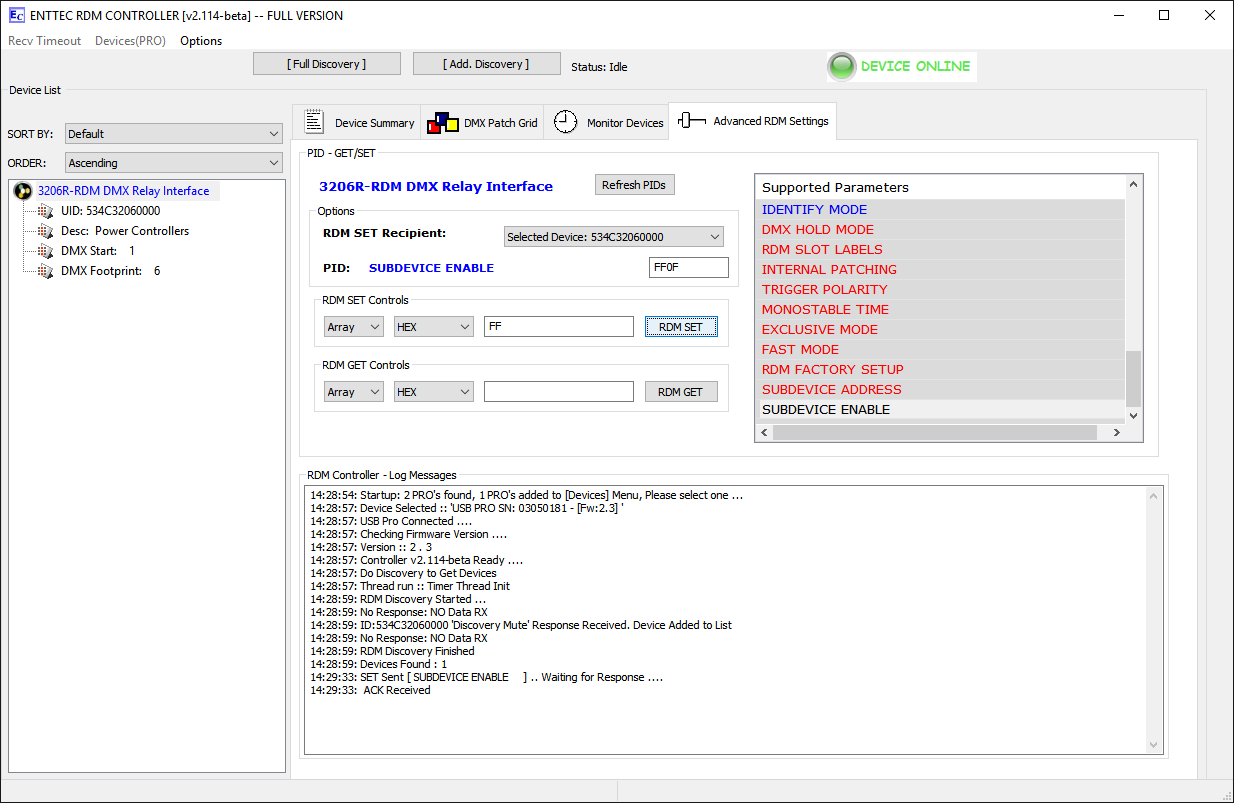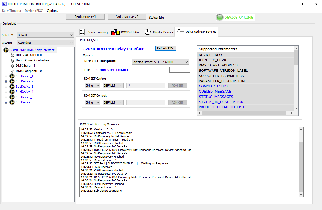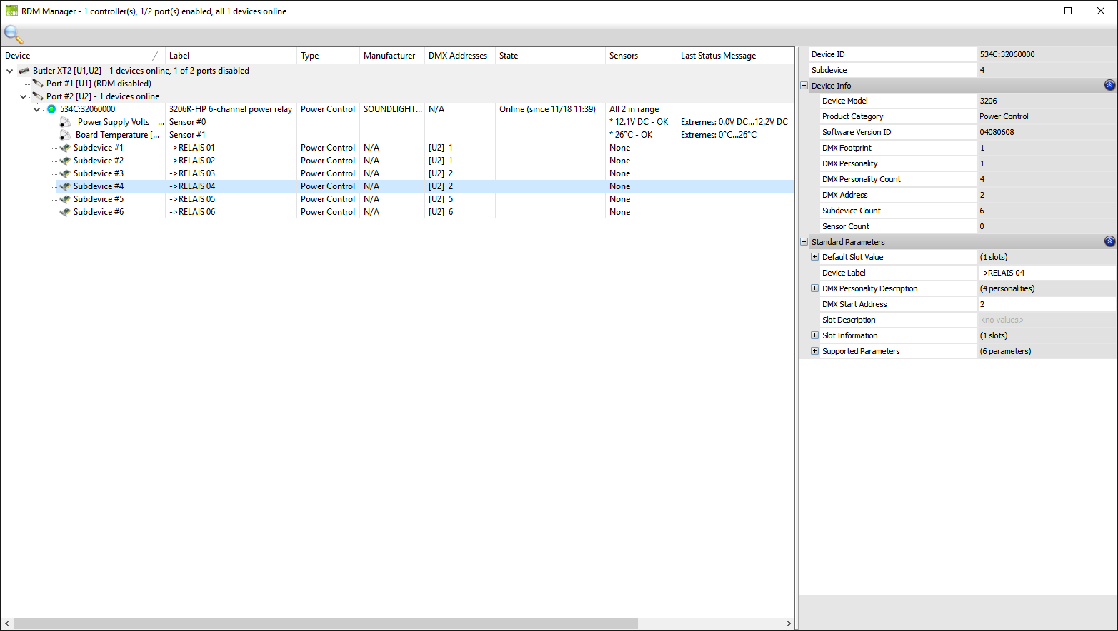 Relaismodule werden im Standardmodus (eine Startdadresse und ein Block von nachfolgenden Adressen für jedes Relais) ausgeliefert. Die Umstellung auf Sub-Device-Modus ist per RDM möglich. Dabei wird das Relaismodul virtuell in mehrere einzelne Einheiten zerlegt (ein 6-Kanal Modul in 6 einzelne Relais), von denen jedes dann eine eigene Startadresse bekommen kann. Bitte beachten Sie, dass die Einstellung über ein Adressboard dann nicht mehr möglich ist. Zudem unterstützen nicht alle RDM-Controller den Subdevice-Modus. |