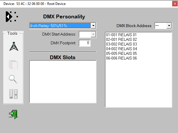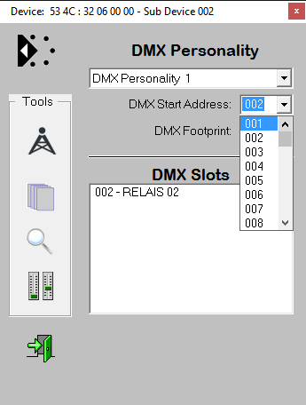 DMX Slot Patching Individual start address settings Splitting up a device into individual SubDevices allows to assign each SubDevice its own properties. The most valuable feature is the possibility to assign indivudual DMX adresses to each of the SubDevices. Thus you are no longer bound by the usual DMX block addressing. There are two options to address the individual relays: