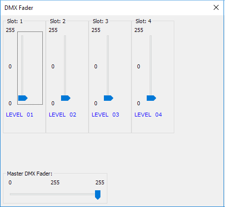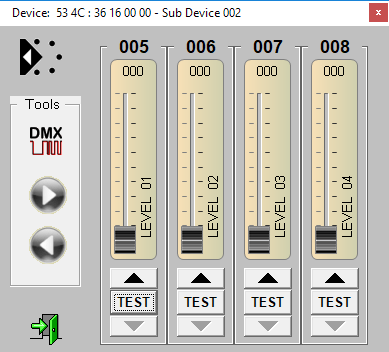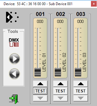 Each SubDevice can be operated using three faders. Also, each SubDevice can be assigned its own DMX start address. When configuring the SubDevice SlotCount, all Subdevice addresses will be automatically re-calculated using the start address of Subdevice #1 and taking into account the number of slots per Subdevice. Assuming Subdevice 1 start address being 11, the list of Subdevice start address would then read 11, 14, 17, 20, 23. Slots not alloctated by a Subdevice will automatically be routed to the Rootdevice. Root-Device slots are controlled by the "normal" DMX start address.