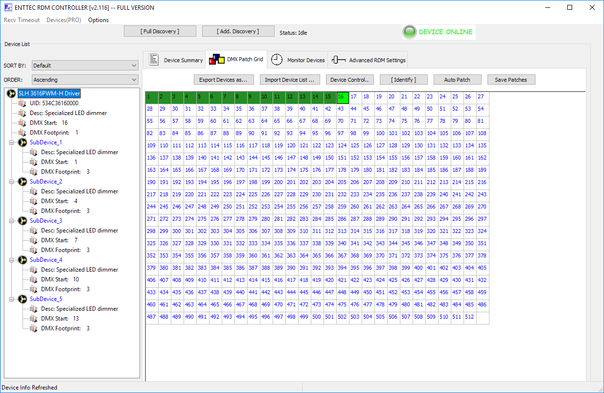The 3616PWM-H comes preset for four SubDevices featuring 4 slots each (4x4=16 slots total, setup for RGBW use). SubDevice will become accessible when activated. |