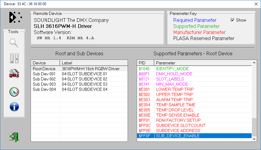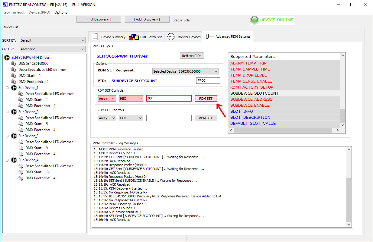 Schreiben Sie ala Parameter "FF", um SubDevices zu aktivieren (Deaktivierten mit "00"). Die Liste der SubDevices wird dann nach einer neuen Discovery ausgegeben. Da die 4 Subdevices alle 16 verfügbaren Slots belegen, bleiben keine weiteren freien Slots übrig. Jedes Subdevice ist somit über 4 Fader steuerbar und kann auch seine eigene Startadresse erhalten.