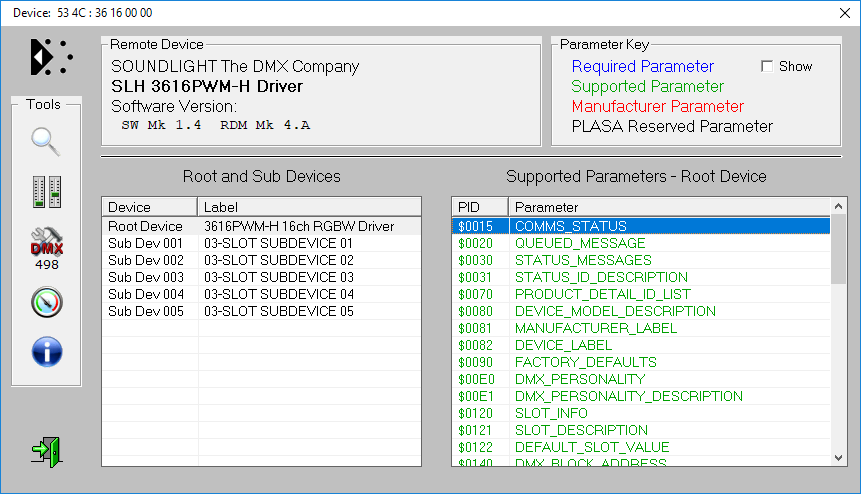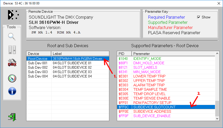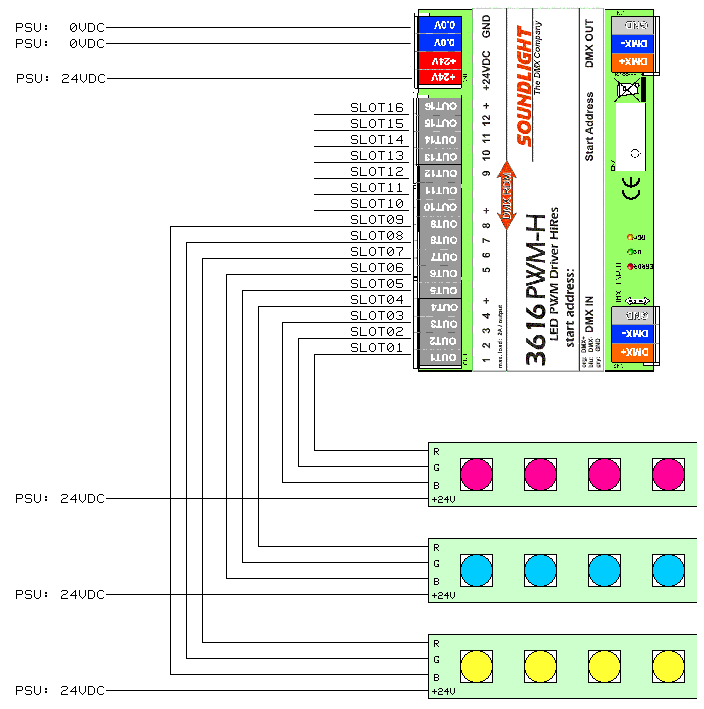 SubDevices SlotCount Spliiting up a device into individual SubDevices allows to assign each SubDevice with its own properties. The most valuable feature is the possibility to assign indivudual DMX adresses to each of the SubDevices. Thus you are no longer bound by the usual DMX block addressing. Usually, a SubDevice consists of a number of slots. Subdevices designed for RGB applications usually have 3 slots, while 4 slots would be needed for RGBW control. Some of our decoders allow to define the number of slots per subdevice to meet your needs. Here is how to do it. For demo purposes, we use the 16-channel LED driver 3616PWM-H. Descriptions are shown for these controllers: