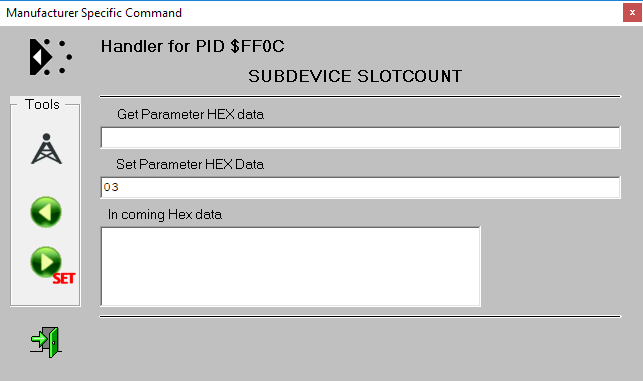 Click the SUBDEVICE SLOTCOUNT command. We will now change the setting to slots per SubDevice vergeben. This will result in 5 Subdevices with one slot remaining, which will automatically be assigned to the Rootdevice. Press SET to issue the write command.